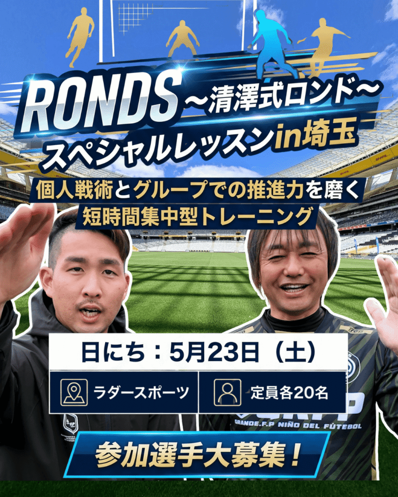 RONDS official website Youtube Instagram Instagram RONDS春の2大キャンペーン RONDSで「異次元のサッカー」を身につけませんか?今なら2つのビッグチャンス!・RONDSアカデミア・RONDSジュニアスクール・アスピランチ共に入会金&4月月謝が【0円】さらに紹介でのご入会なら5月月謝も【0円】に。初期費用を抑えてスタートできる絶好の機会です。※2026/04/30まで ※6ヶ月間の継続が条件。不明な点はDMください! RONDサッカースクール RONDアスピランチ詳細 RONDSアカデミア詳細 スペシャルレッスンin埼玉 個人戦術とグループでの推進力を磨く 「2つの柱」に特化した短時間集中型トレーニング 小学生から大人まで、レベルアップを目指す全年代対象!!お申し込みお待ちしております!! イベント詳細はこちらから! 清澤式ロンド最強の1対1戦術【一瞬でプレー激変】清澤式ロンド特別レッスン開催!テーマは「最強の1対1戦術」。2/15寒川・3/14小田原にて。小4〜シニア対象。定員各20名、ロンドマスター「キヨさん」が直接指導。進化のチャンスを見逃すな! スペシャルレッスン詳細はこちら 有料動画第14弾 《セットアップメニュー②ゲートを置き去りにする基礎知識と基礎感覚TR》(2)様々なコンドゥクシオン・TR方法 【1週間限定特別価格】3,999円(税込) (特価期間:4月24日(金)18:00~5月1日(金)23:59まで 【通常価格】5,980円(税込) 清澤式ロンド学ぶ最高の教材をご用意!! こ清澤式ロンドの真髄を深く理解し、実践的なテクニックを習得できる有料トレーニング教材の販売ページです。 ONLINE STOREはこちら 〜清澤式ロンドサッカー研究所〜 RONDSアカデミア サッカーメソッド〝清澤式ロンド〟を、個人でも、チームでも身につけたり、応援したり、情報交換したり、普及活動に参加したりする広場が、RONDSアカデミアです。 アカデミア詳細・お申し込み RONDSサッカースクール相模原校 / 横浜瀬谷校 2回まで体験参加【無料】 横浜瀬谷校は、サッカーやフットサルで必要な技術を〝基礎と基本〟から習得し、プレーヤーとして成長する為の土台を築くこと。相模原校は、主にミニゲーム形式で『ロンドスタイル/局面での戦い方』をメインに学ぶことができ、実践形式の戦い方を教えていきます。 無料体験・スクール詳細 NEWS 2025/10/01更新 オフィシャルウェア【仁者無敵】期間限定販売!!2025/05/30更新 RONDS OFFICIAL ONLINE STORE公開しました2025/3/22更新 RONDSアカデミア情報公開 RONDS代表 清澤の初となるサッカー書籍 清澤式ロンド解剖図鑑 大好評発売中!! 清澤式ロンド解剖図鑑の詳細 スポンサー方法の詳細はこちら 多種多様な才能が在籍するインフルエンサー集団「RONDS」 RONDS TEAM MEMBERS RONDSメンバーについて知りたい RONDSの活動をYouTubeにて絶賛公開中! YouTubeでは、ロンドマスター清澤の指導のもと「清澤式ロンド」のトレーニングの様子を公開しております。ロンドを習得するために奮闘するRONDSメンバーの応援をどうぞよろしくお願いいたします。 サッカーW杯で日本が優勝する姿が見たい サッカーの神様ジーコその兄であるエドゥとの出会いそして見つけた自分の夢 清澤 光伸の STORY を知りたい 「自分が生きているうちに日本がW杯で優勝する姿が見たい」RONDS代表の清澤が、いつも口癖のように声に出す夢があります。荒唐無稽な夢だと笑う人もいるかもしれません。しかし、20年もの期間をロンドの研究に捧げ、馬鹿正直に夢を語り、サッカーと向き合い続けた男がRONDS代表「清澤光伸」です。 個性の集団 RONDS の使命清澤式ロンドを伝授する為の「伝道師」となってもらう RONDSは、ロンドマスター清澤を筆頭に、元Jリーガー、元Fリーガーとして活躍したプレーヤー、現役のフットサルプレーヤー、ソサイチプレーヤーだけでなく、インフルエンサーとして活動するプレーヤーなど多種多様な才能が在籍しています。 RONDSとして一緒に活動したい 清澤式ロンドという戦い方で日本サッカーの新時代が幕を開ける 近年、国内海外問わずより高いチームレベルを目指すため、サッカーの「戦い方」は目まぐるしい変化を見せており、その一つが「ロンド」という戦い方です。このロンドという戦い方こそまさにRONDS代表の清澤が、20年間の歳月をかけて研究し続けてきた清澤式の戦い方であり「清澤式ロンド」です。ロンドという戦い方を取り入れることで、日本サッカー界の新時代が幕を開けるのです。 清澤式ロンドっていったい何? 2031年までに、日本全国へ清澤式ロンドを届けたい RONDSは、2031年までに日本全国の都道府県で、「清澤式ロンド」の指導を完了させることを目標の一つに掲げて活動しています。 訪問指導について相談する 日本各地で「ロンドが学べる」その環境をRONDSで作る 夢を叶えるためのRONDSのロードマップ 現 在 ~2024年 ・YouTubeによる認知度向上・RONDSの覚醒 〜ロンドスタイルを試合で立証〜・顧問契約チーム10チームの達成 2024年〜2026年 ・提携チームから都道府県の頂点を獲らせる・全国9地域でのロンド実演クリニック予算『630万円』の協賛金獲得 ※応援してくれる個